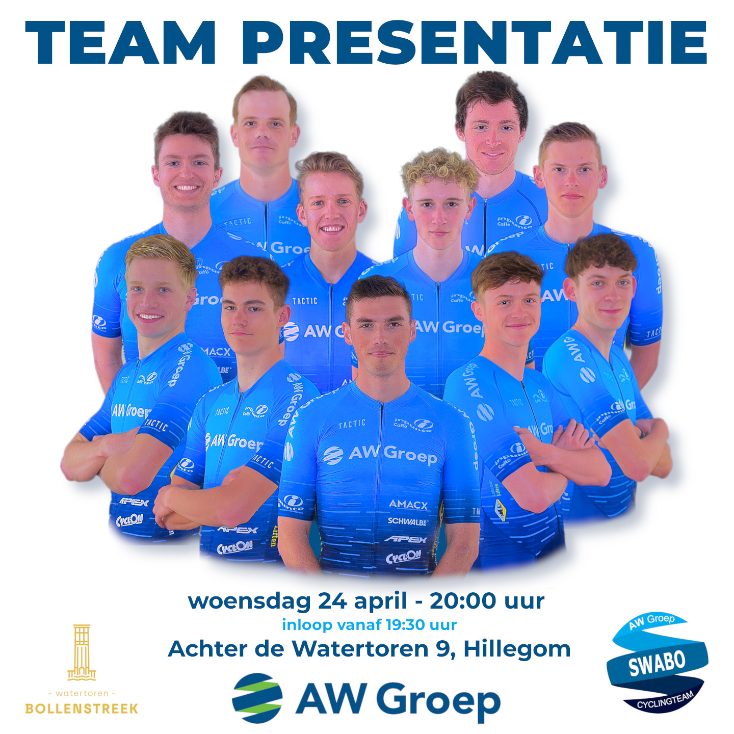 Woensdag 24 april om 20:00 uur vindt de team presentatie van het AW Groep SwABo Cyclingteam plaats. De inloop is vanaf 19:30 uur. De presentatie vindt plaats in de Watertoren Bollenstreek bij onze hoofdsponsor AW Groep.