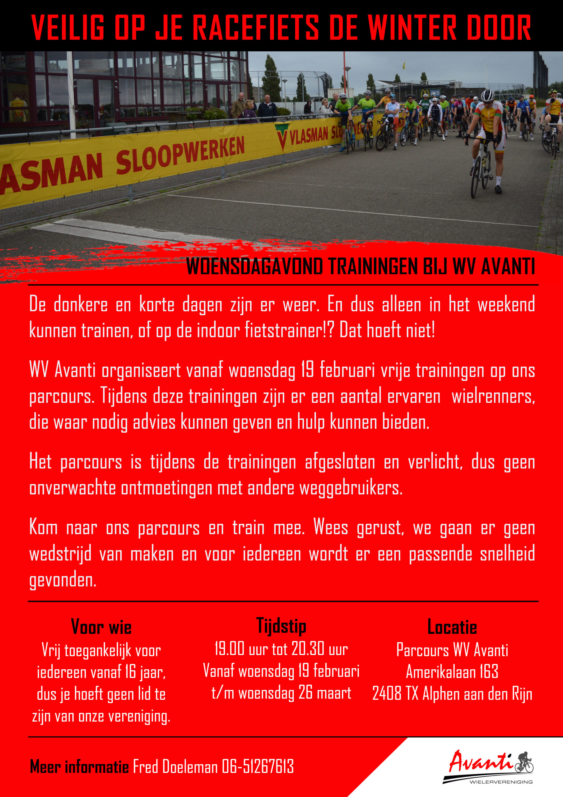 WV Avanti organiseert vanaf woensdag 19 februari vrije trainingen op ons parcours. Tijdens deze trainingen zijn er een aantal ervaren wielrenners, die waar nodig advies kunnen geven en hulp kunnen bieden.